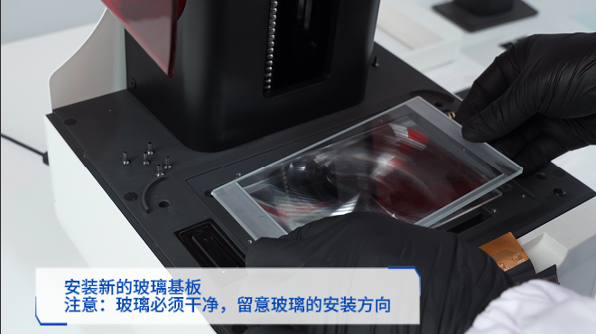 1.关闭打印机。 2.撕除固定胶带。 3.拆除压框。 4.移除玻璃基板和菲涅尔透镜。 5.安装新的菲涅尔透镜(有磨砂的一面朝上)。 6.安装新的玻璃基板(注意玻璃的安装方向)。 7.C型压框复位。 8.开启打印机。 9.投光检查。 10.再次关闭打印机。 11.安装压框。 12.粘贴胶带。 13.检查胶带位置。