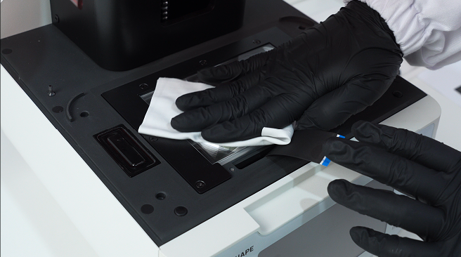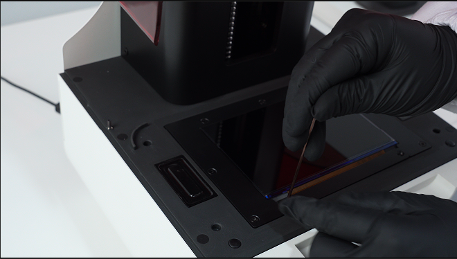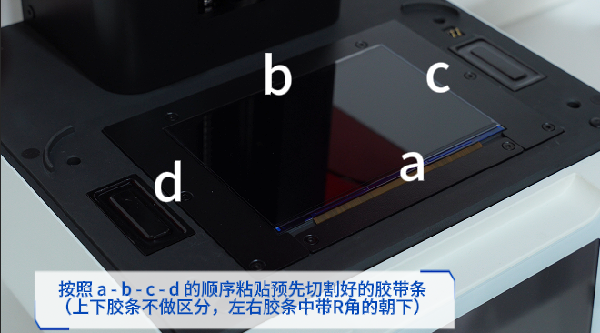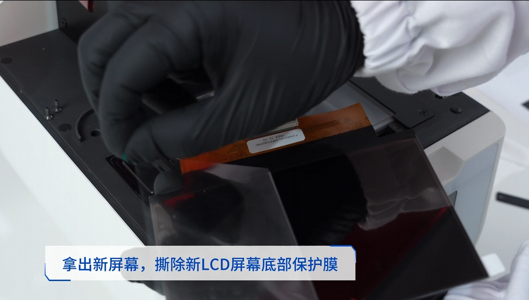 1.关闭打印机。 2.撕除固定胶带。 3.拆除压框。 4.拆除屏幕排线。 5.用无尘布清理玻璃基板。 6.撕除LCD屏背面保护膜。 7.重新安装屏幕排线。 8.开启打印机。 9.投光检查。 10.再次关闭打印机。 11.安装压框。 12.粘贴胶带。 13.检查胶带位置。
