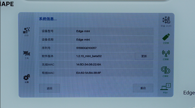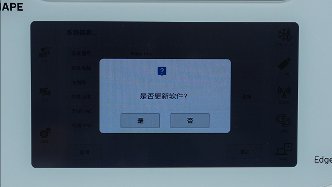 获取最新设备软件版本请访问: 最新版设备软件下载汇总页 1.将最新版本的软件更新包存储在USB根目录中。 2.插入U盘。 3.点击“设备”-“系统信息”-“更新”。 4.重启设备。 5.确认版本更新完成。