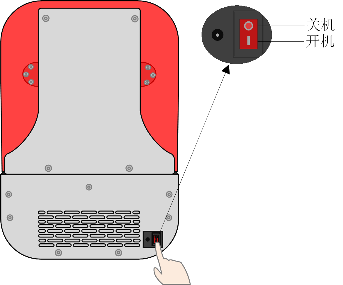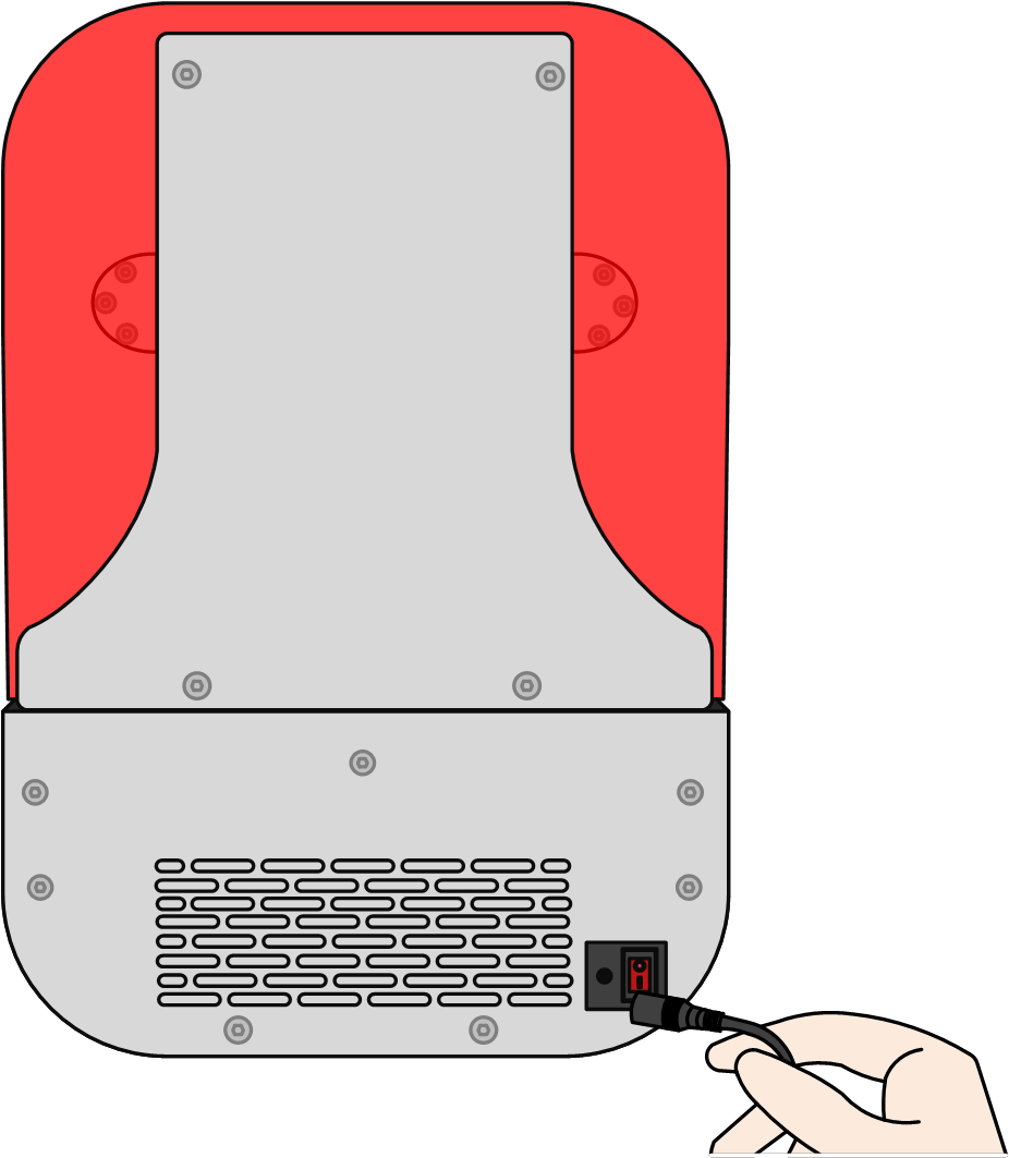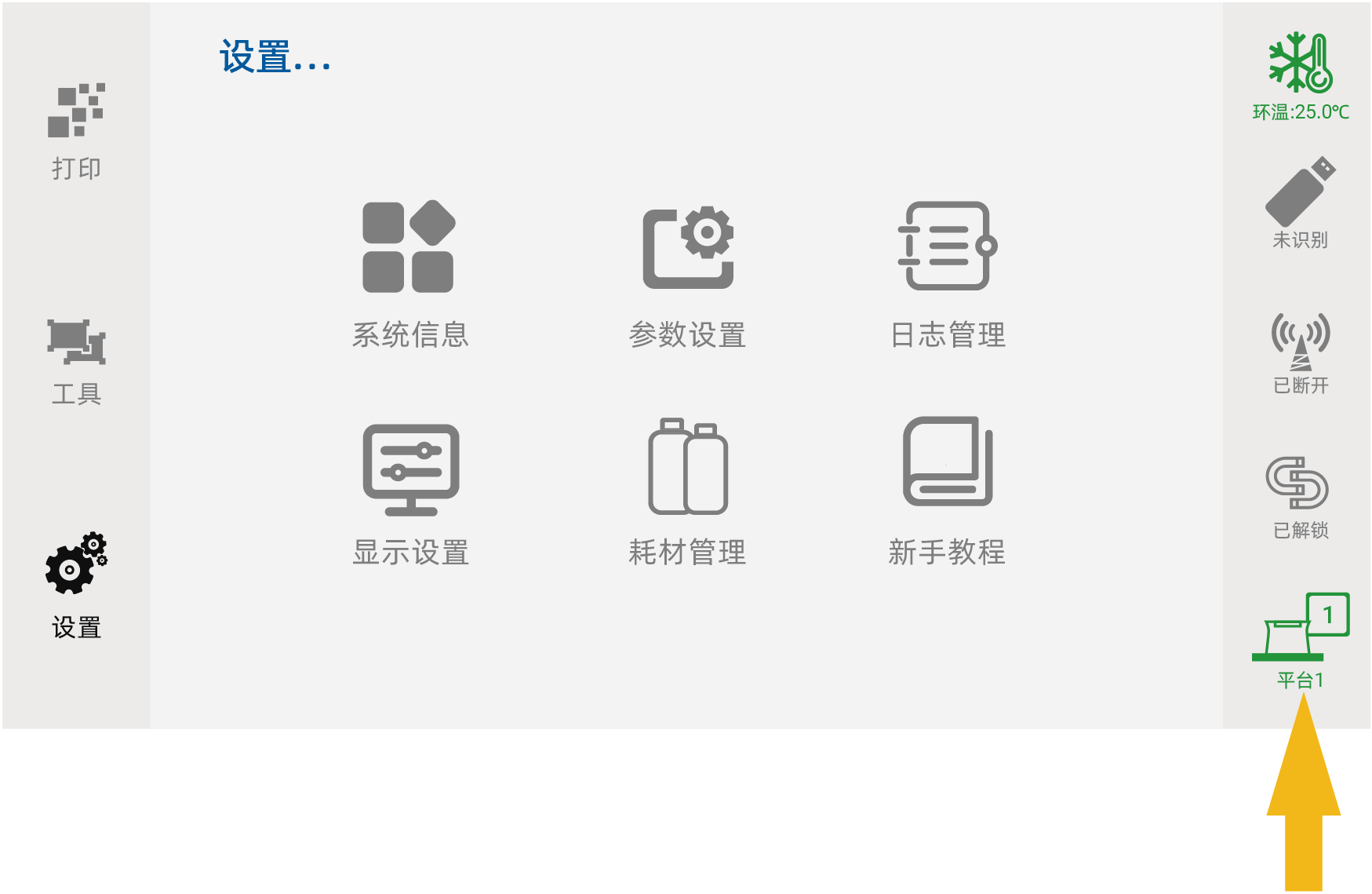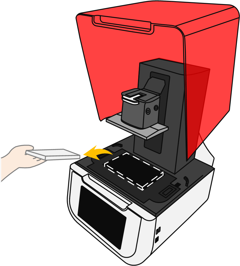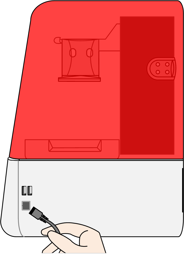 1.插入适配器电源线,需使用带接地的电源插座,且电源规格需满足设备使用要求; 2.插入网线(按需); 3.将鞍形开关从“O”拨至“I”,设备开机; 4.开机后操作设备控制软件,点击“工具-Z轴调试-移至顶部”,上升成型平台; 5.成型平台上升到位后,取下防护泡棉; 6.上下扳动紧固扳手,测试平台拆装效果; 7.树脂槽平推到位,测试自动磁吸效果; 8.目测确认成型平台编号,默认为1#平台。