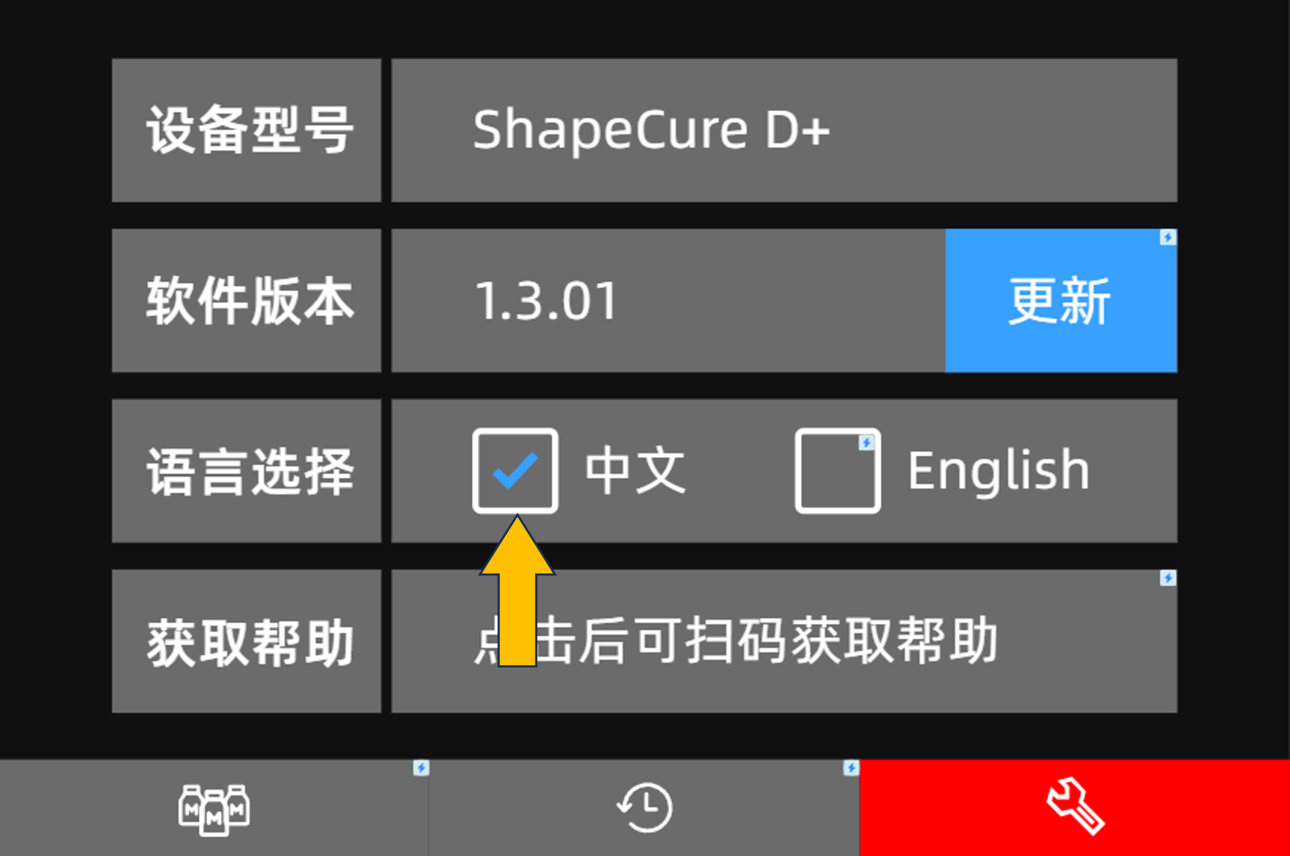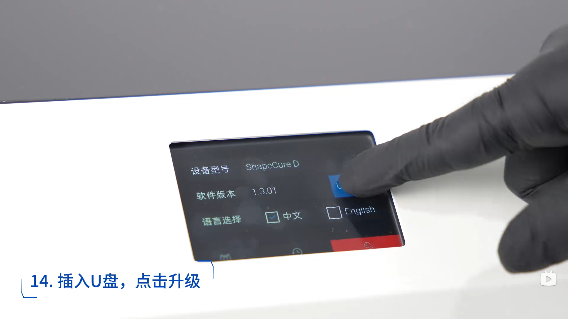 获取最新设备软件版本请访问: 最新版设备软件下载汇总页 1.点击上方链接跳转下载最新版控制软件 2.将最新版本的软件更新包存储在USB根目录中。 3.插入U盘 4.点击“设置-更新”,更新至最新版控制软件 5.点击“设置-语言选择”切换至适合的语言